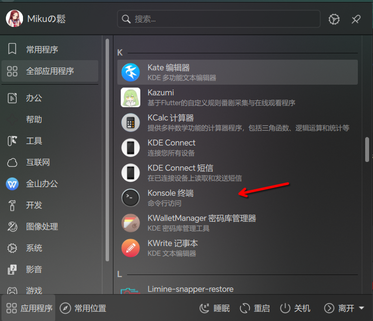下滑找到 Konsole 终端并打开。