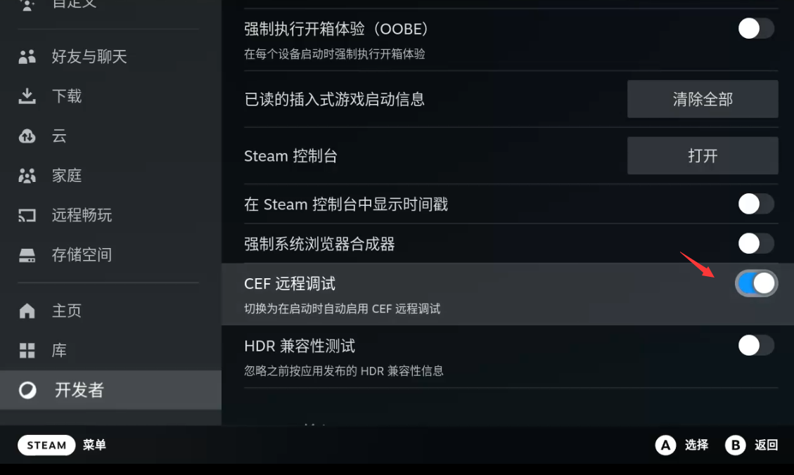 按STEAM键 – 设置 – 开发者 – 启用CEF远程调试
