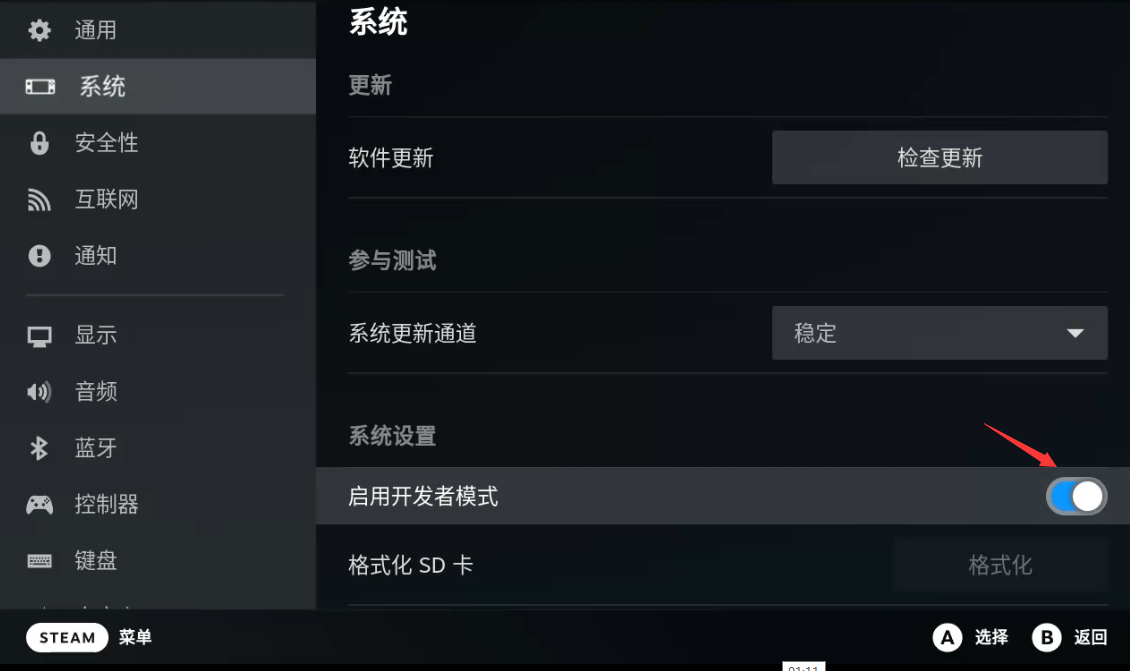 按STEAM键 – 设置 – 系统 – 启用开发者模式